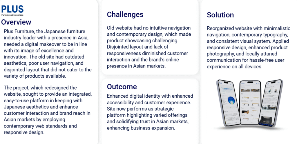 As a leading Japanese furniture company with operations across Asia, PLUS sought a digital presence that reflected its reputation for quality and innovation. The redesign aimed to create a cohesive, user-friendly platform aligned with Japanese design sensibilities.