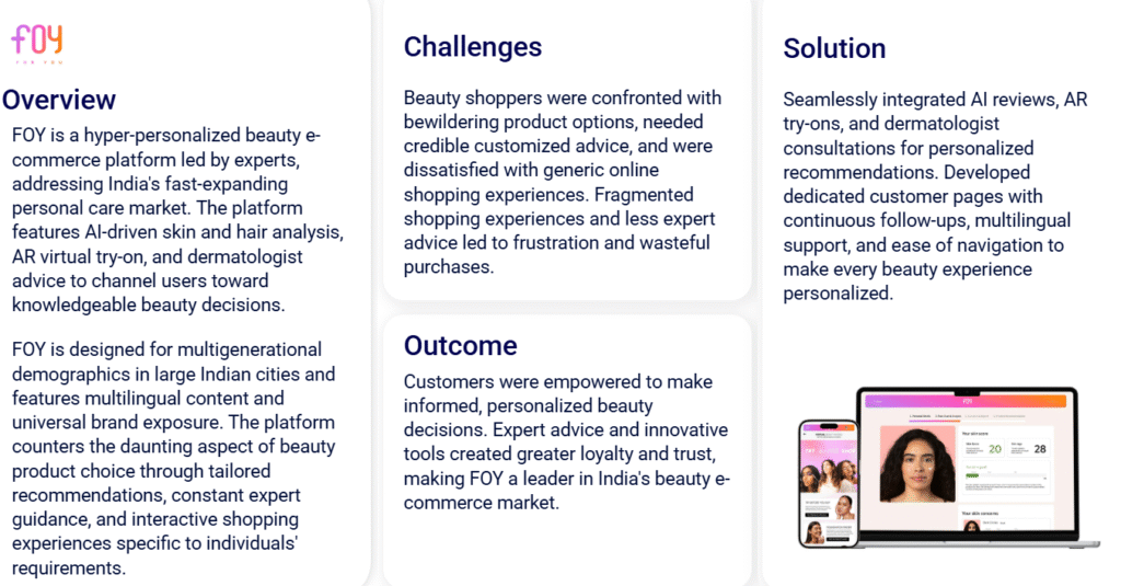 FOY is a hyper-personalized beauty e-commerce platform led by experts, addressing India's fast-expanding personal care market. The platform features AI-driven skin and hair analysis, AR virtual try-on, and dermatologist advice to channel users toward knowledgeable beauty decisions.