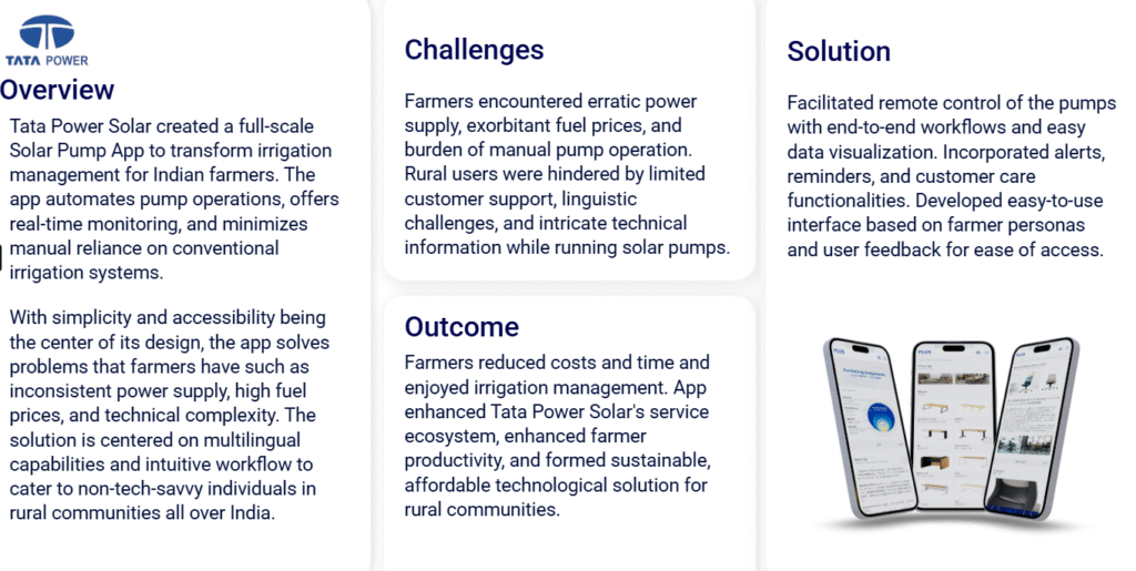 Farmers reduced costs and time and enjoyed irrigation management. App enhanced Tata Power Solar's service ecosystem, enhanced farmer productivity, and formed sustainable, affordable technological solution for rural communities.