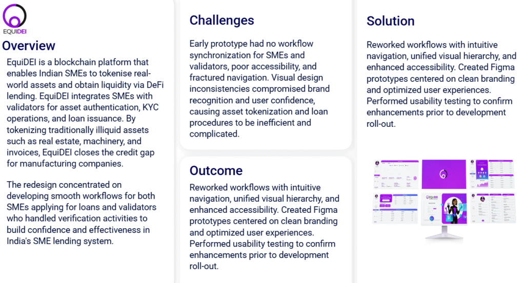 EquiDEI is a blockchain platform that enables Indian SMEs to tokenise real-world assets and obtain liquidity via DeFi lending. EquiDEI integrates SMEs with validators for asset authentication, KYC operations, and loan issuance. By tokenizing traditionally illiquid assets such as real estate, machinery, and invoices, EquiDEI closes the credit gap for manufacturing companies.